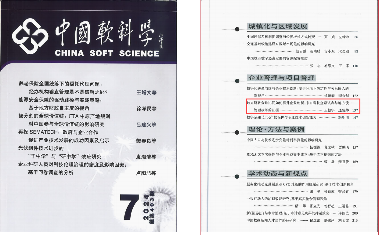 国产一区二区日本在线经济学院王振宇教授与博士研究生逄雯婷合作撰写的论文《地方财政金融协同如何提升企业创新:来自科技金融试点与地方债管理改革的证据》在《中国软科学》2024年第7期发表。