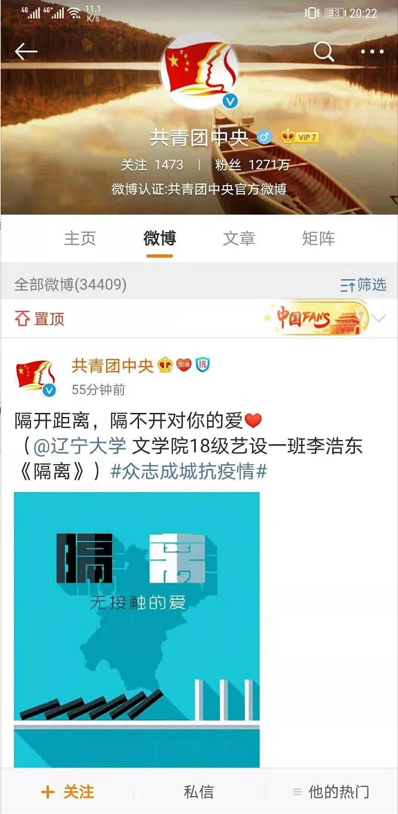 近日,“共青团中央”官方微博、《辽宁日报》客户端、《沈阳日报》“帅正新闻”等媒体发布了我校文学院学生为抗击疫情设计海报的新闻,报道中不仅对我校创作的海报进行了展示,同时对海报的设计进行了详细介绍,现将报道截图转载如下: