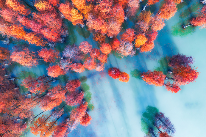 △2020年12月,中国东部浙江省杭州市青山湖水上森林景观。茂密的池杉林生长在水中,挺拔俊秀,树影、湖光、天景构成了一美丽的风景画。(源自:视觉中国)